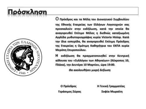 Σήμερα, είναι μια σημαντική στιγμή για την ιστορία της Εταιρείας μας, καθώς ανακηρύσσεται επίτιμο μέλος της, για πρώτη φορά μια γυναίκα, η εμπνευσμένη από τη χώρα μας μυθιστοριογράφος Victoria Hislop. Και είναι εξαιρετικά σπάνιο το γεγονός ένας ξένος λογοτέχνης να επιλέγει το θεματολόγιό του από τη σύγχρονη Ελλάδα κι όχι από την αρχαία, η οποία αποτελεί αστείρευτη θεματολογική δεξαμενή σε παγκόσμιο επίπεδο. Και ακόμα πιο σπάνιο είναι το γεγονός ότι η συγγραφέας δεν εμπνεύστηκε από τη σύγχρονη κοινωνική και πολιτιστική ζωή του τόπου, αλλά έστρεψε την προσοχή της σε ένα άκρως περιθωριοποιημένο χώρο, ένα χώρο ταμπού. Η Hislop επέλεξε αυτό το απαιτητικό θεματολόγιο για να συγγράψει, το 2005, ένα μυθιστόρημα, εκτεινόμενο σε 500 σχεδόν σελίδες. Αυτή ακριβώς η επιλογή της την ανάγκασε να διαπλάσει ήρωες ιδιάζουσας φυσιογνωμίας, γεγονός που σίγουρα της δημιούργησε πολλές δυσκολίες, στις οποίες αντεπεξήλθε επιτυχώς, κατορθώνοντας να αποτυπώσει ιδιαίτερα πειστικούς χαρακτήρες, οι οποίοι αποδόθηκαν εξαίρετα από τους ηθοποιούς στο γνωστό σήριαλ.